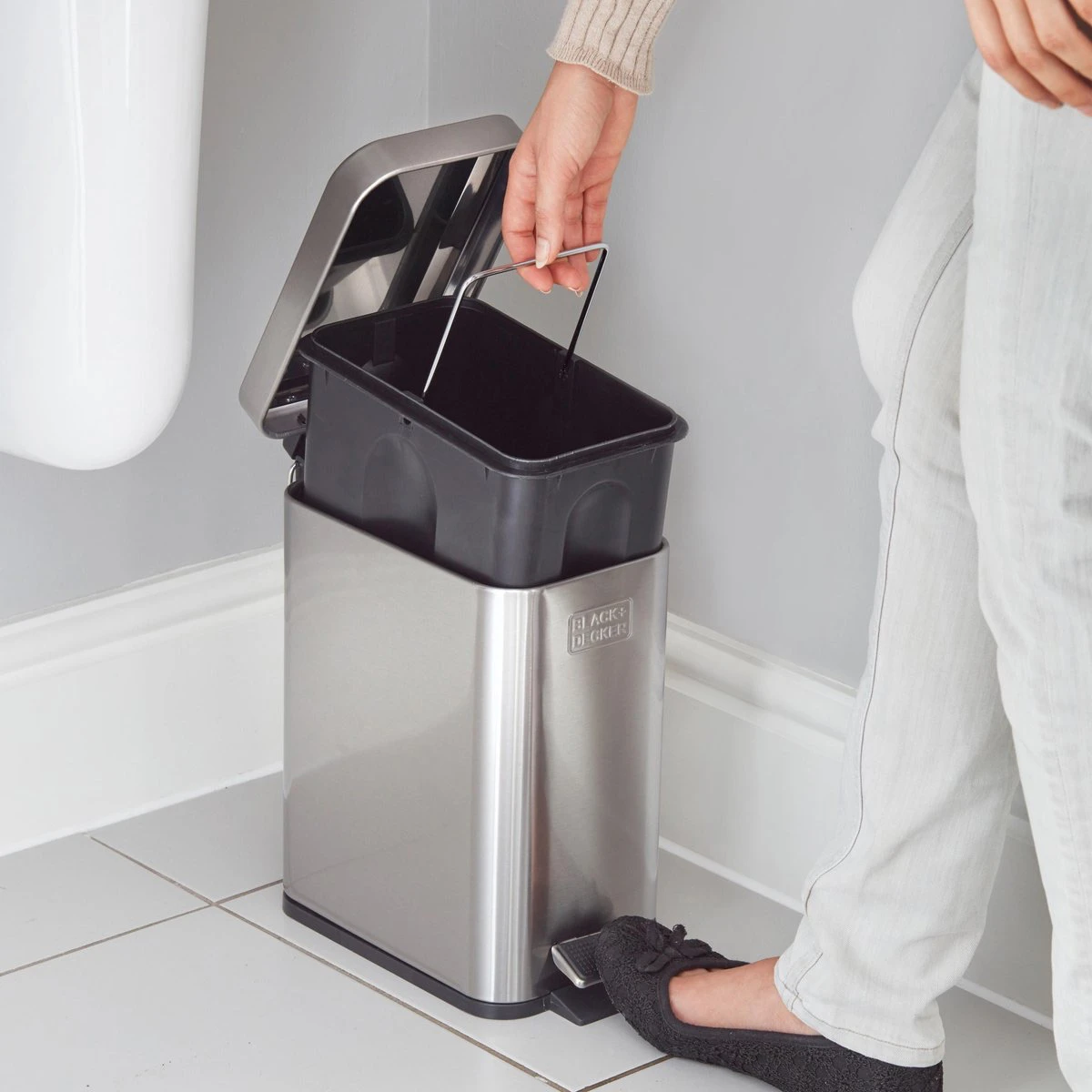 Deze pedaalemmer van Black + Decker van RVS is ideaal om te plaatsen in de badkamer of toilet. De pedaalemmer heeft een losse binnenemmer van 5 liter, dit maakt het een mooi klein formaat voor deze ruimtes. De binnenemmer is gemaakt van kunststof en heeft een metalen hengsel, zodat je deze gemakkelijk uit de emmer kan halen. De pedaalemmer is hygiënisch in gebruik, je bedient de deksel met je voet. Het deksel is soft close, deze gaat zacht en langzaam dicht.