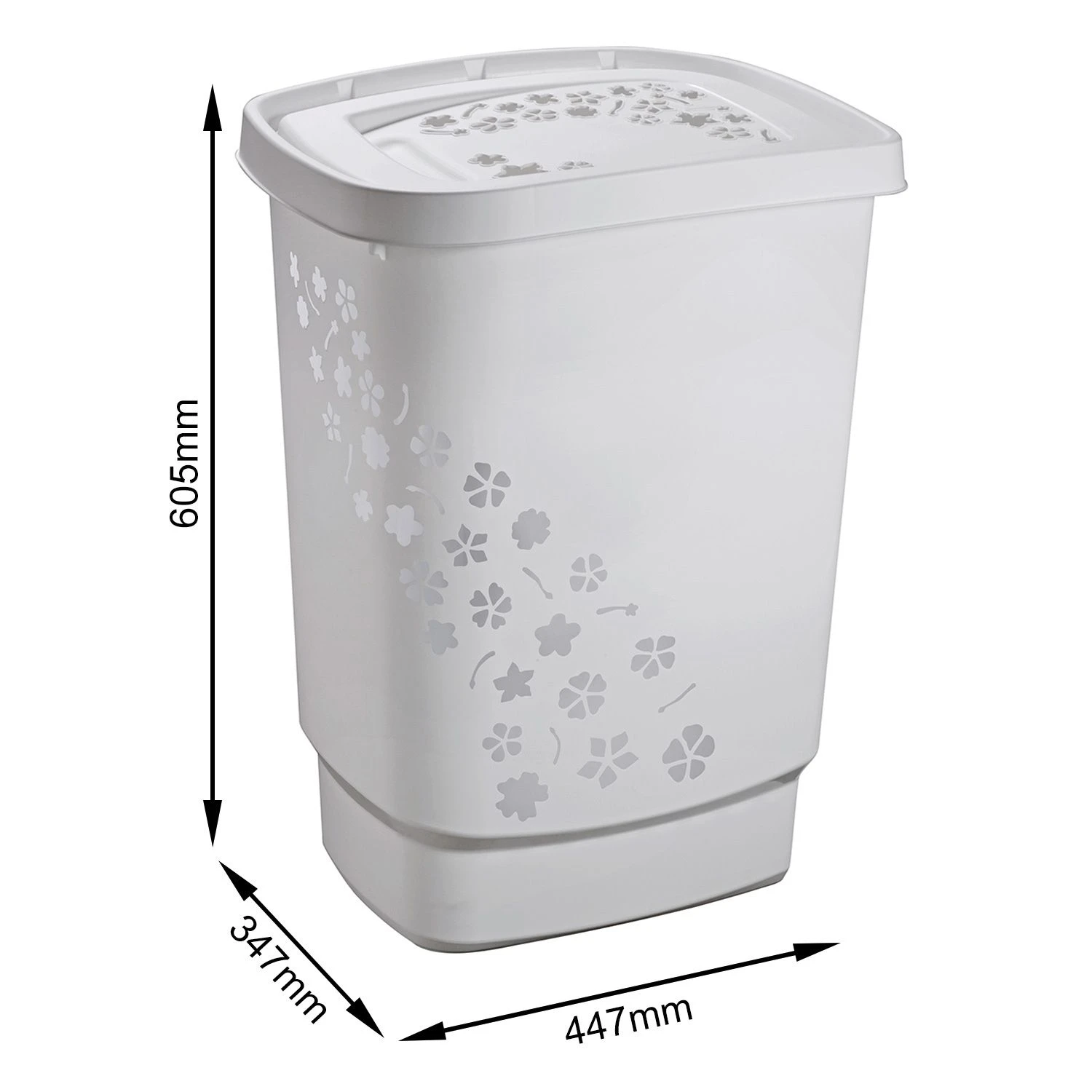 Met afmetingen van 447 mm breed, 347 mm diep en 605 mm hoog past de Rotho Wasbox Design 55 l FLOWERS Cool Grey perfect in elke wasruimte of badkamer. De wasmand is eenvoudig te verplaatsen, dankzij de geïntegreerde handgrepen aan de zijkanten.